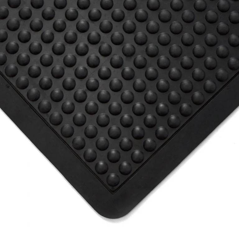 Anti-fatigue mat designed to reduce strain during long standing periods. Features a bubble-textured surface for comfort, support, and improved circulation, making workstations safer and less tiring.