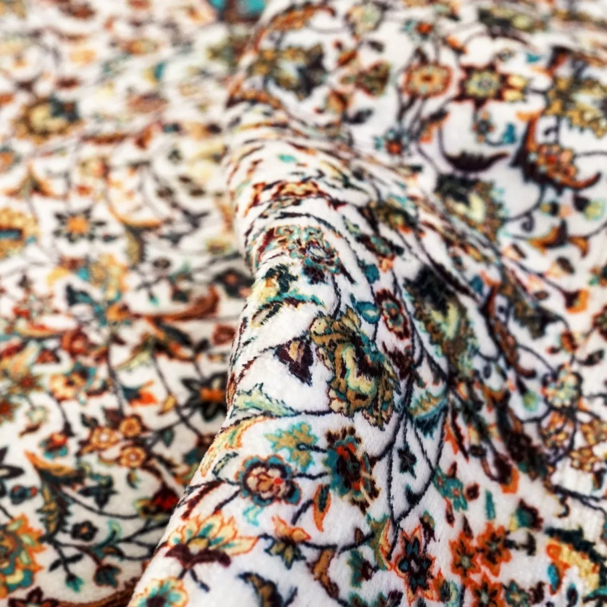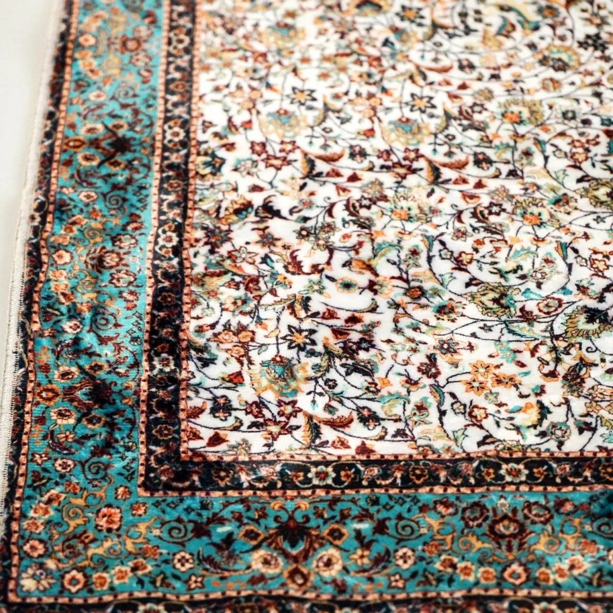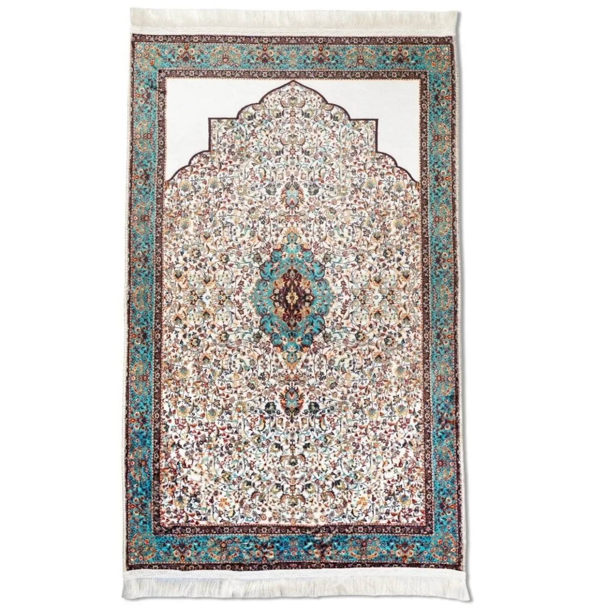 This aqua and beige Islamic prayer mat features soft acrylic fabric and intricate ornate patterns. Comfortable, durable, and elegant, this prayer mat supports daily Salah while adding style and devotion to home or mosque prayer spaces.