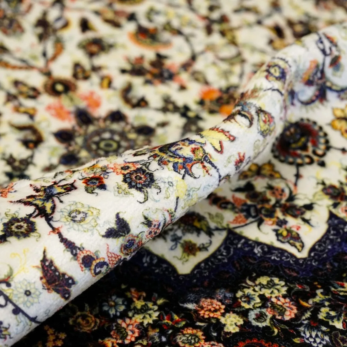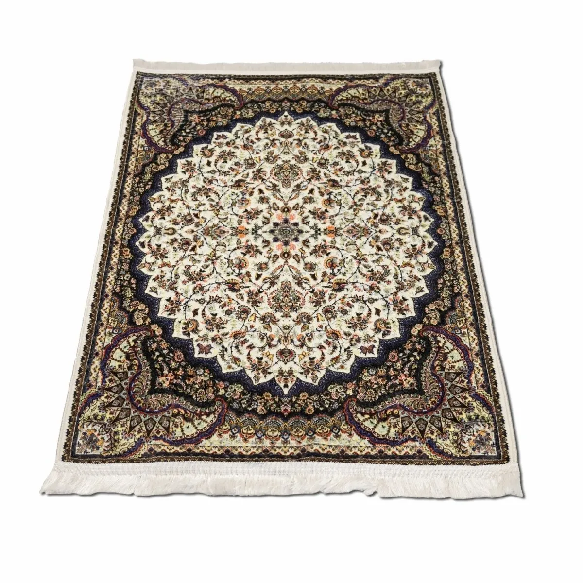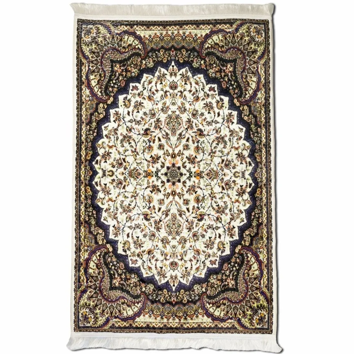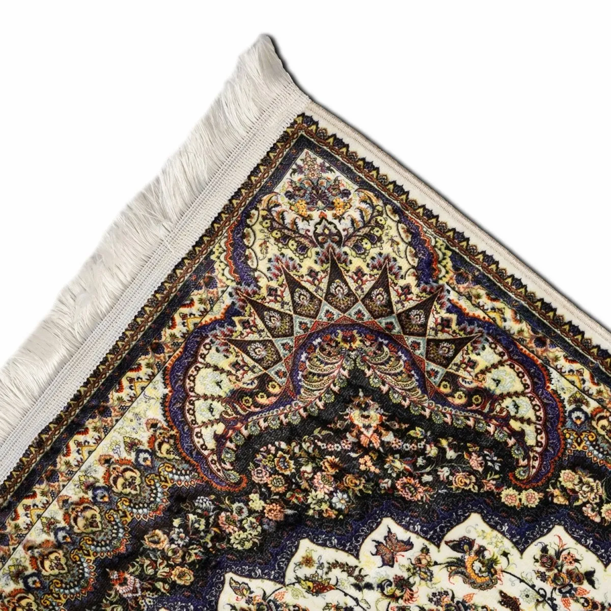 This beige and black Islamic prayer mat features soft acrylic fabric and vintage floral patterns. Comfortable, durable, and elegant, this prayer mat brings timeless style and functionality to your home or mosque prayer space.