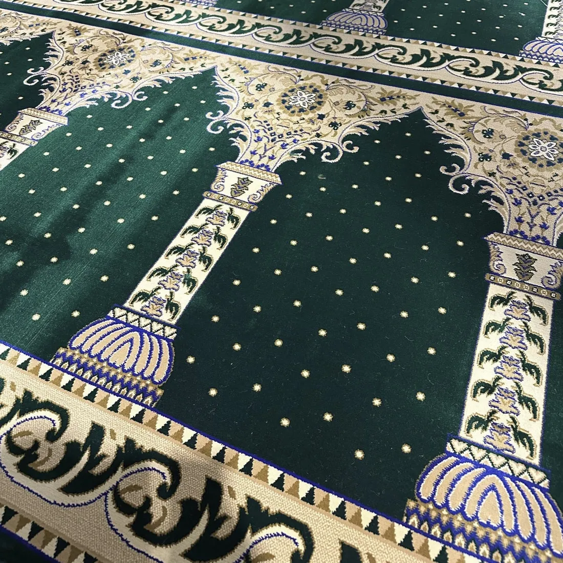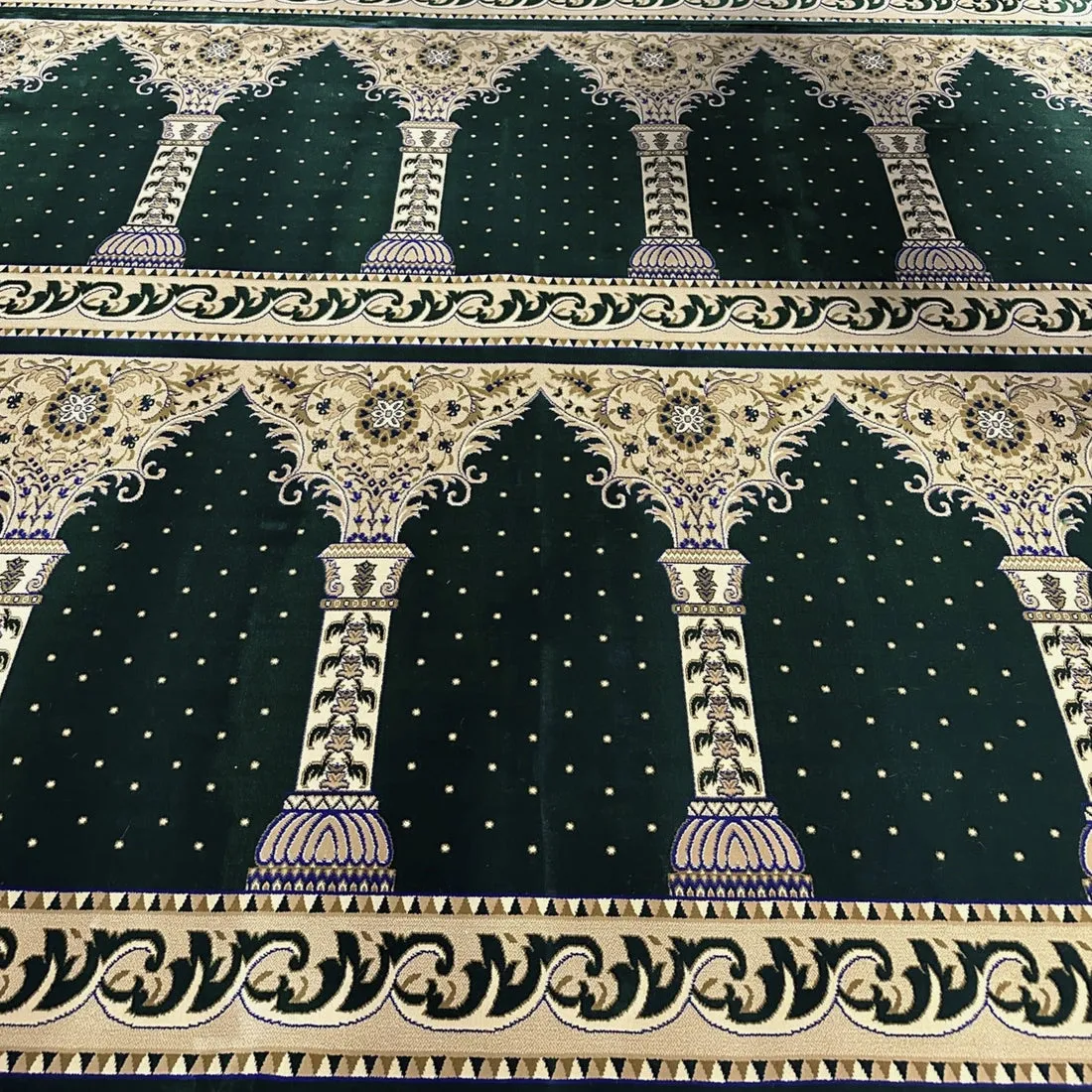Dubai Green mosque carpet offers thick, dense comfort for prayer halls. With 14 mm pile height, 1 million points per square meter, and elegant arch design, this mosque carpet provides durability and support for daily salah.