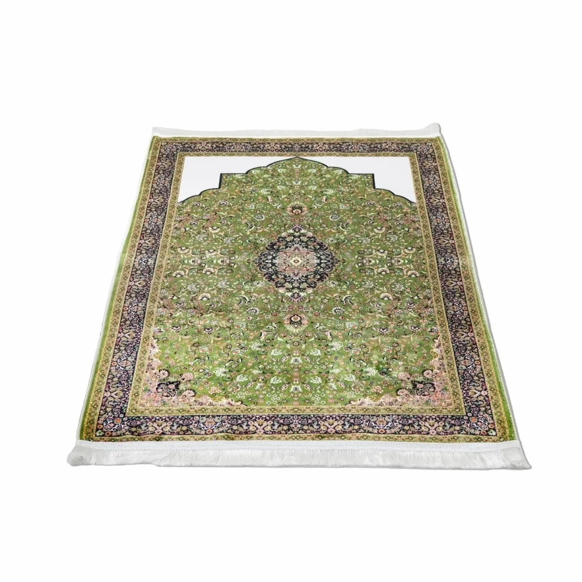 This green and black Muslim prayer mat features soft acrylic fabric with ornate Islamic patterns. Durable, comfortable, and elegant, this prayer mat creates a calm and sophisticated environment for daily Salah at home or mosque.