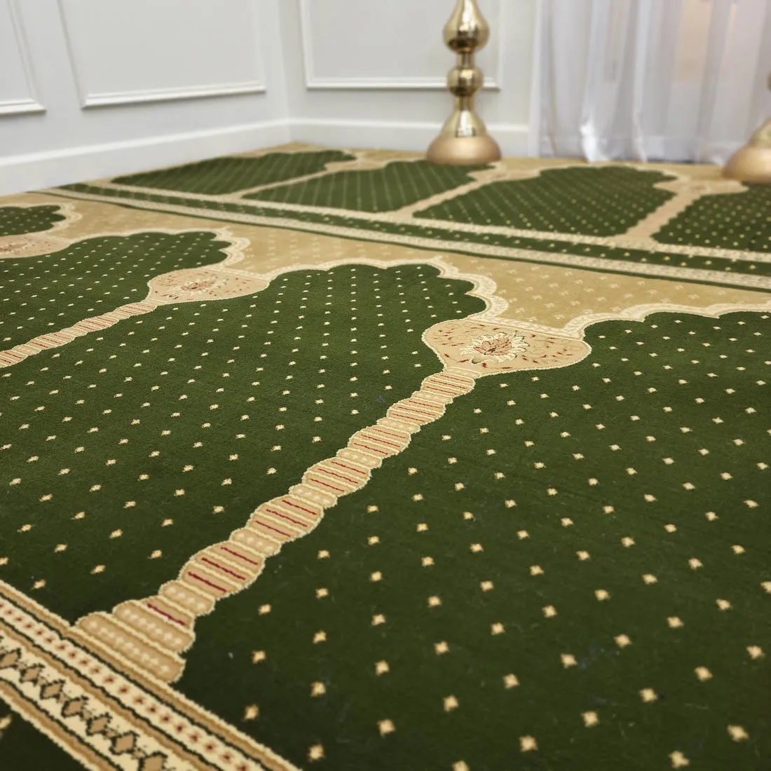 Madina Green mosque carpet offers thick, dense comfort for prayer halls. With 14 mm pile height, 1 million points per square meter, and elegant arch design, this mosque carpet provides durability and support for daily salah.