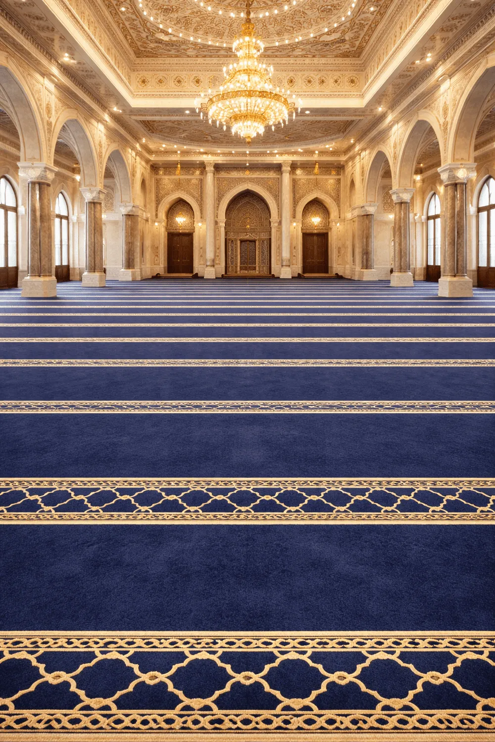 Navy Blue mosque carpet offers plush 12 mm pile and 1.3 million points per square meter. Elegant arch prayer-row design provides comfort, durability, and refined Islamic aesthetics for mosques and prayer halls.