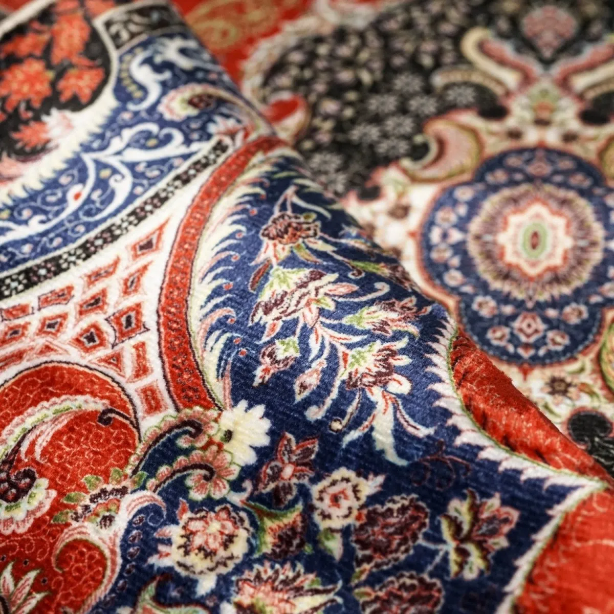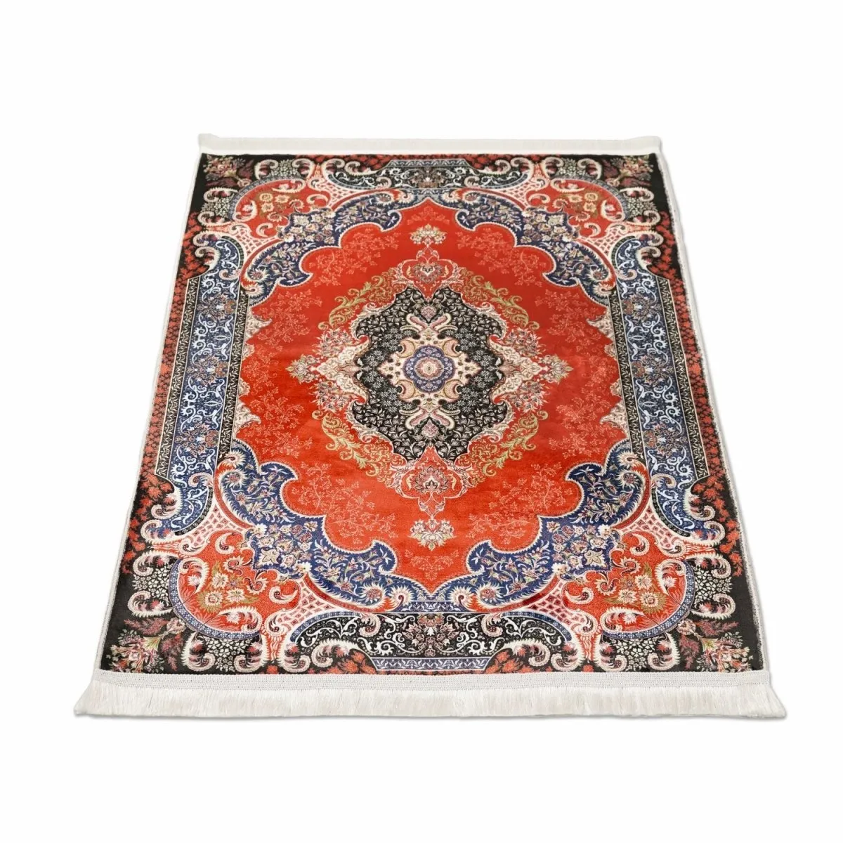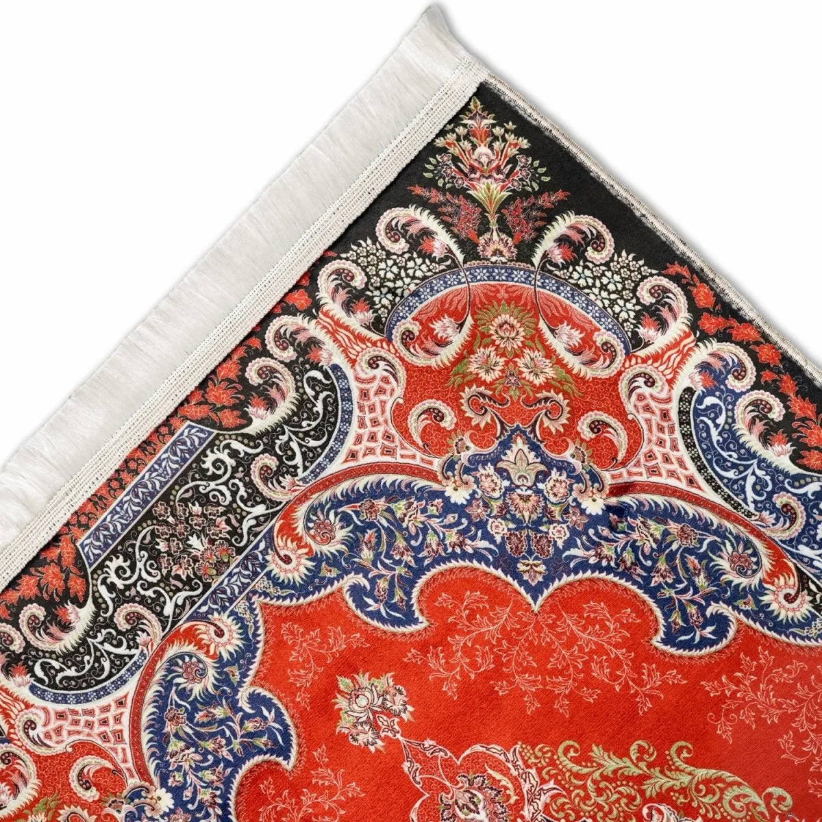 This red and black Muslim prayer mat features soft acrylic fabric and detailed floral design. Durable, comfortable, and elegant, this prayer mat enhances your daily Salah experience at home, mosque, or any prayer space.
