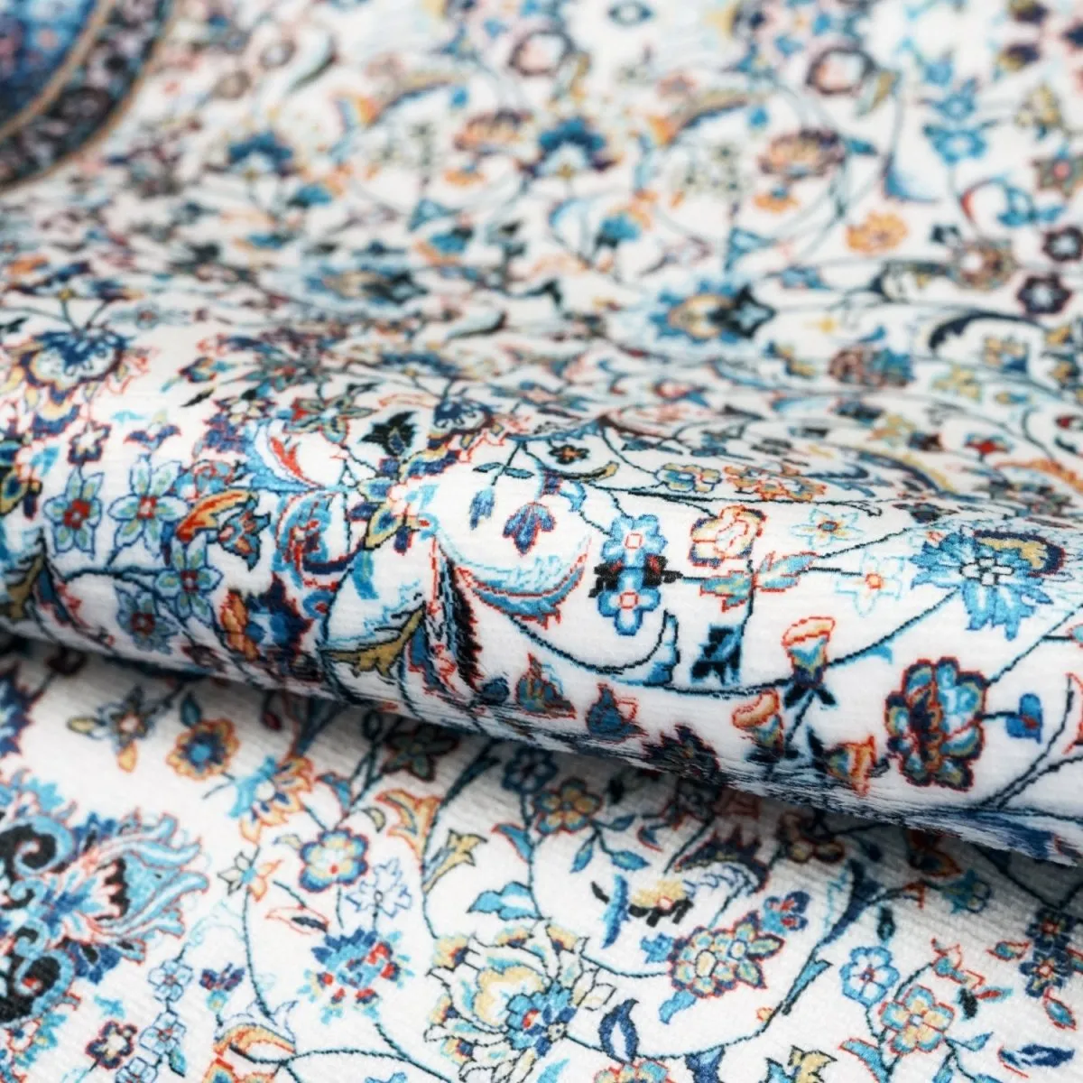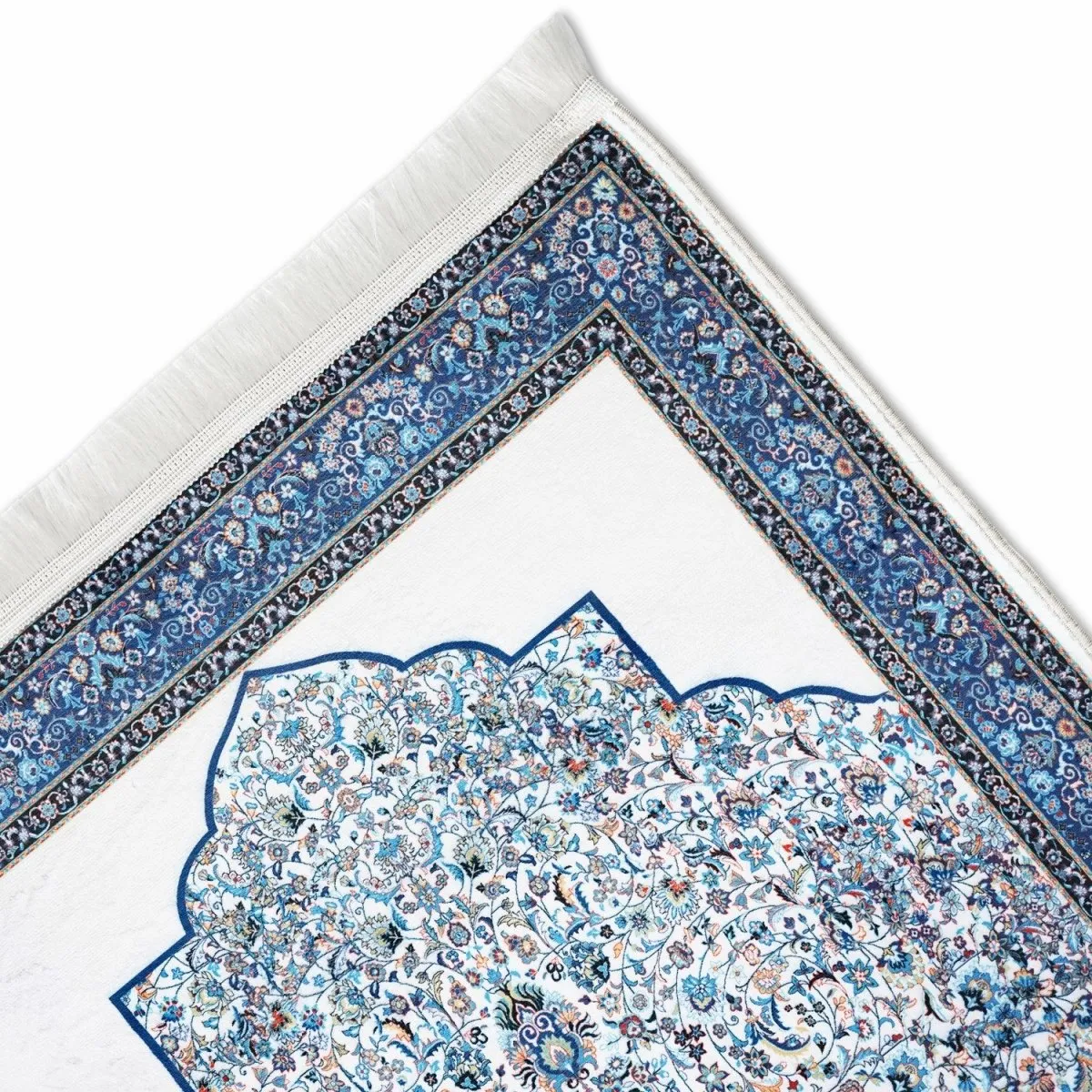 This white and blue Islamic prayer mat features soft acrylic fabric and classic ornate patterns. Comfortable, durable, and elegant, this prayer mat reflects Islamic heritage while providing a peaceful space for daily Salah at home or mosque.