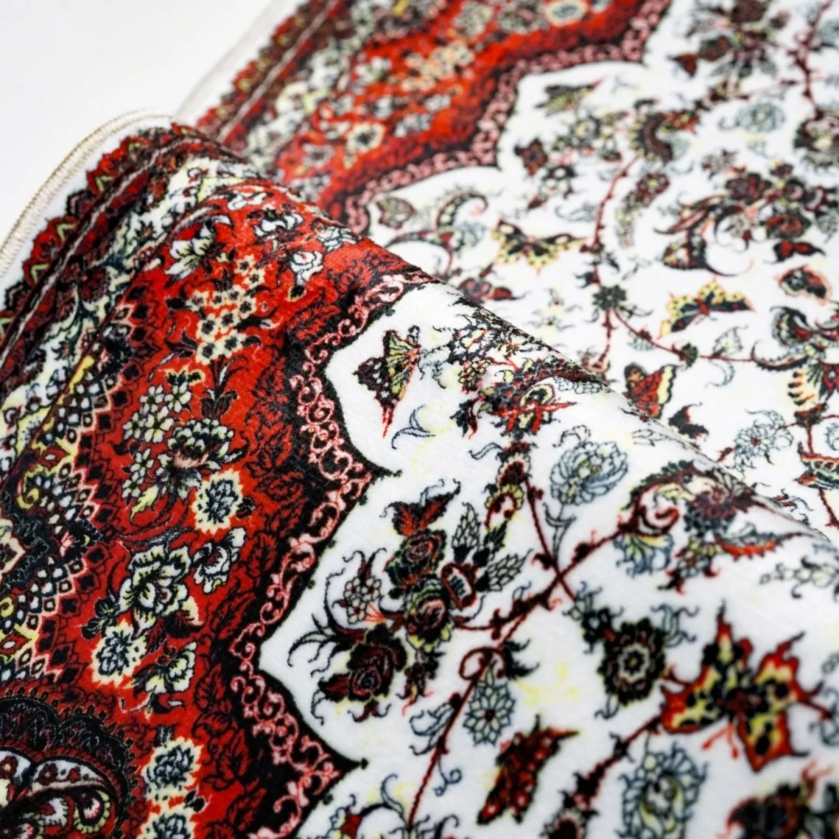 This white and red Islamic prayer mat features soft acrylic fabric and ornate patterns. Comfortable, durable, and elegant, this prayer mat creates a serene and refined space for daily Salah at home or mosque.